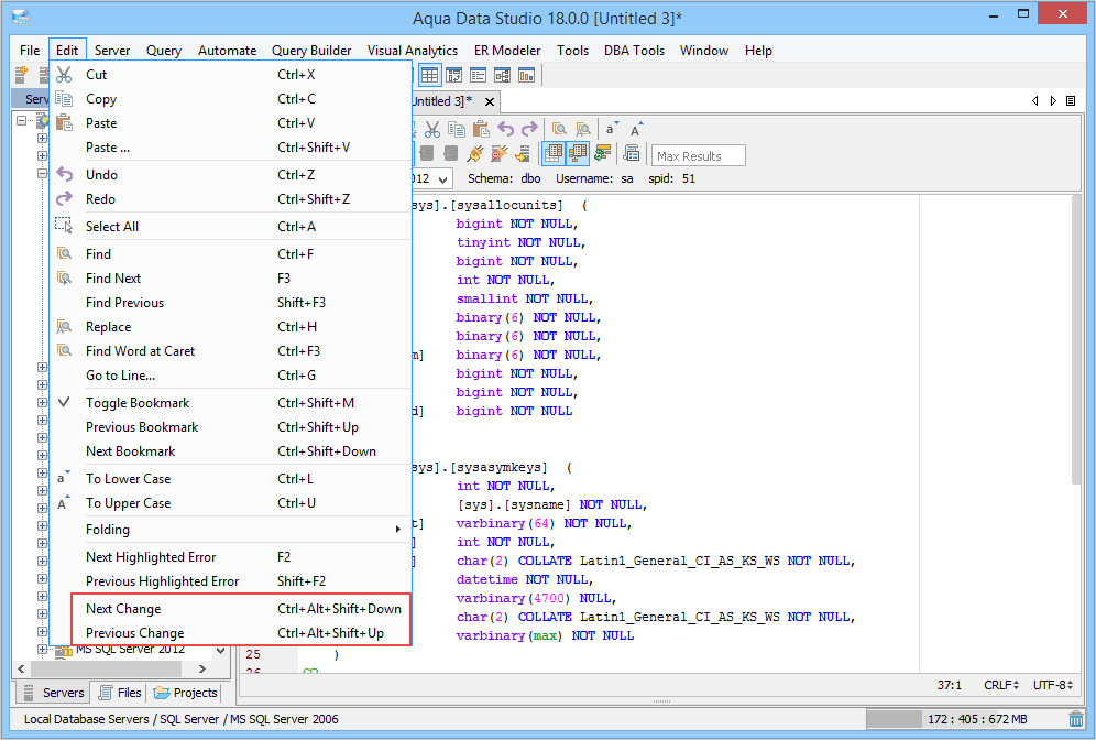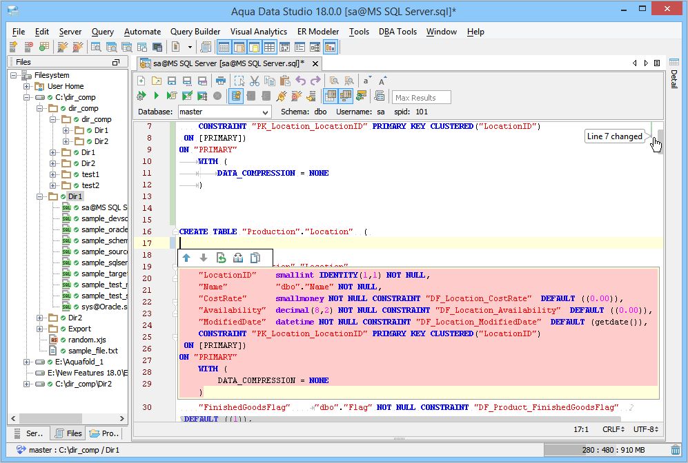 When you modify a file in a version controlled repository, Aqua Data Studio displays inline diff indicators on the Annotation bar. The inline diff indicator automatically indicates the differences between the edited file and its corresponding file in the repository using a different color for each action; a green diff indicator () signifies addition and a blue diff bar indicator (