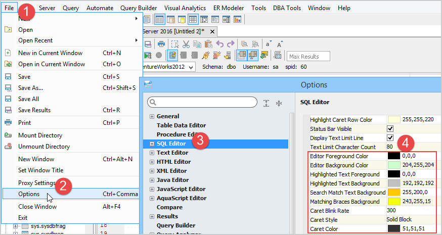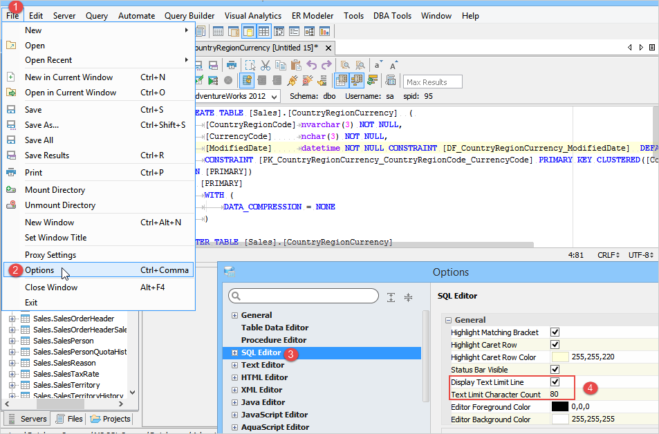 By default, a light gray vertical line appears at column 80 in the editor, indicating where a line exceeds 80 characters. You can set this text limit indicator to another value from the Options dialog. If you change the font, Aqua Data Studio plots the line based on the word space of the set font.