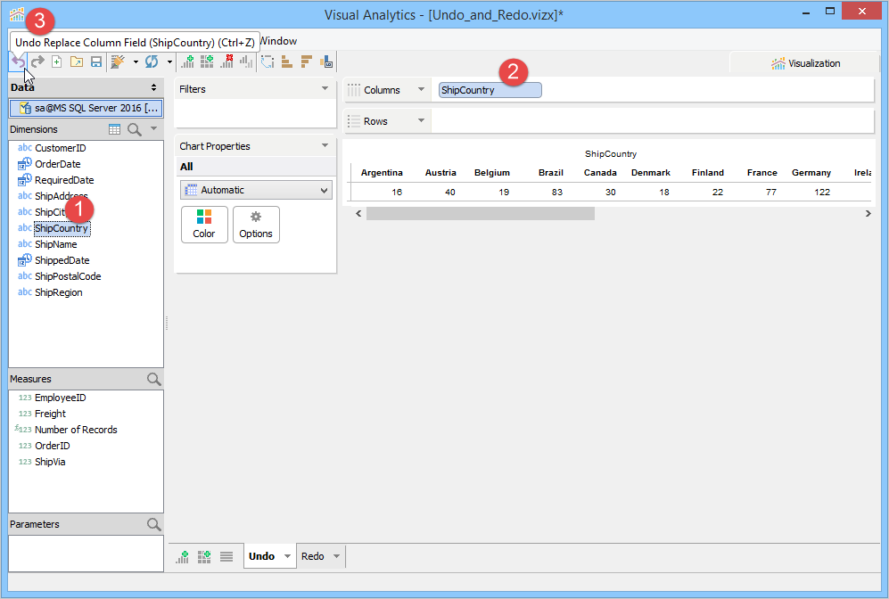 Hovering over the Undo or Redo button provides a tooltip of the most recent action taken which can be undone/redone.
