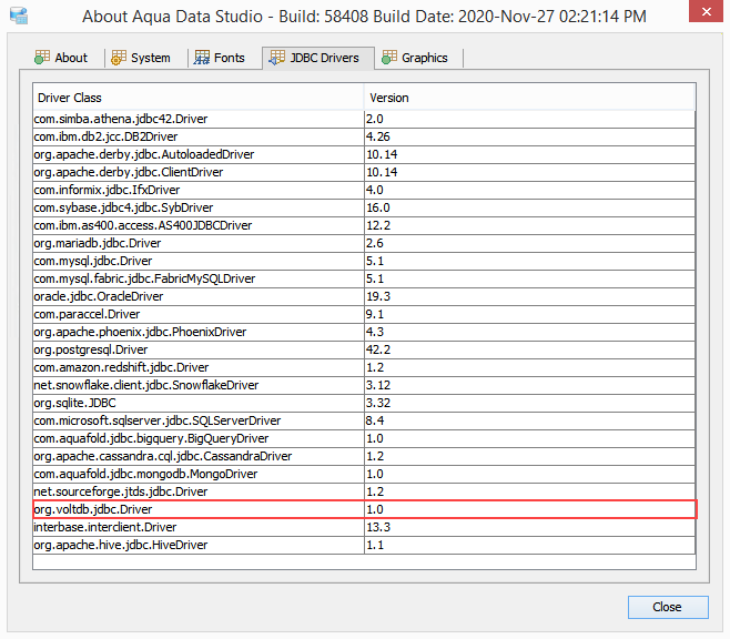 To update the Aqua Data Studio JDBC drivers for VoltDB you need to overwrite the Aqua Data Studio voltdb.jar file. Below is a listing of the Aqua Data Studio library directory [ADS_INSTALL]\lib\drivers\ ...