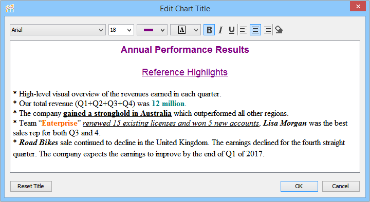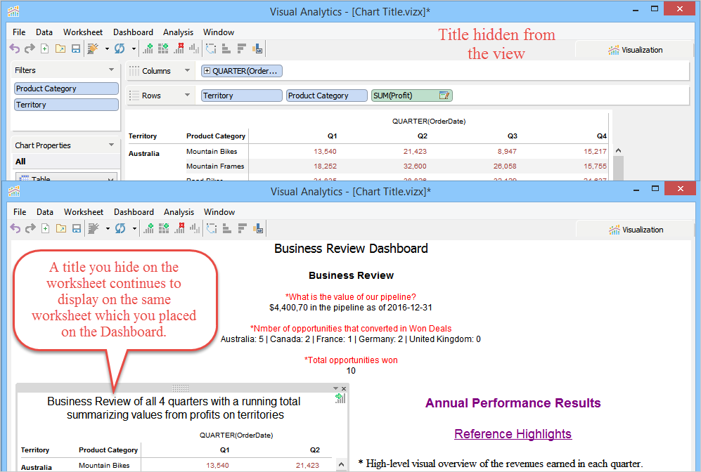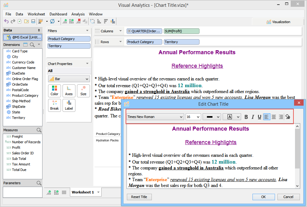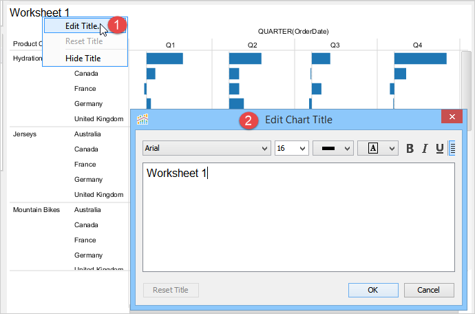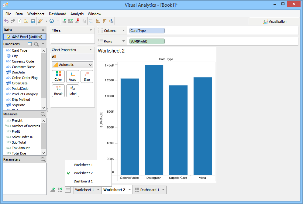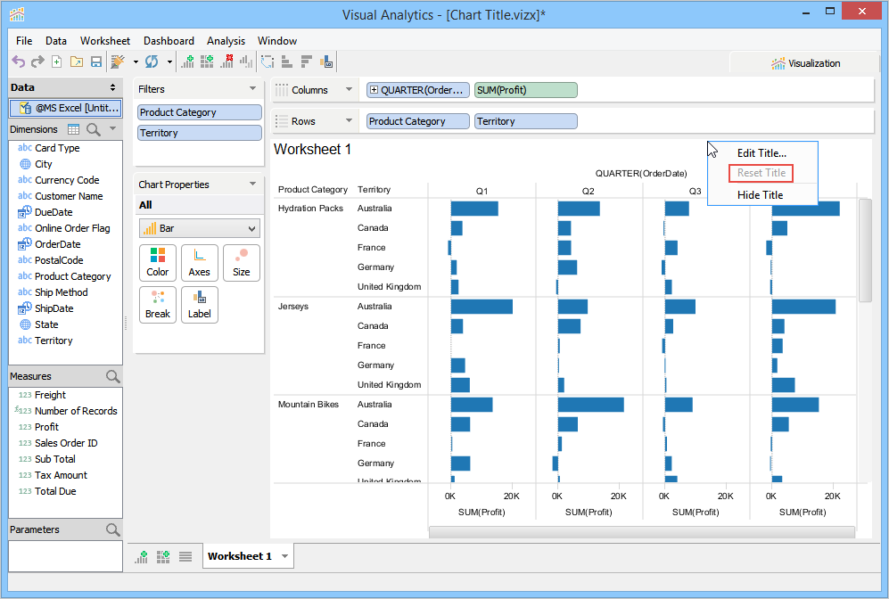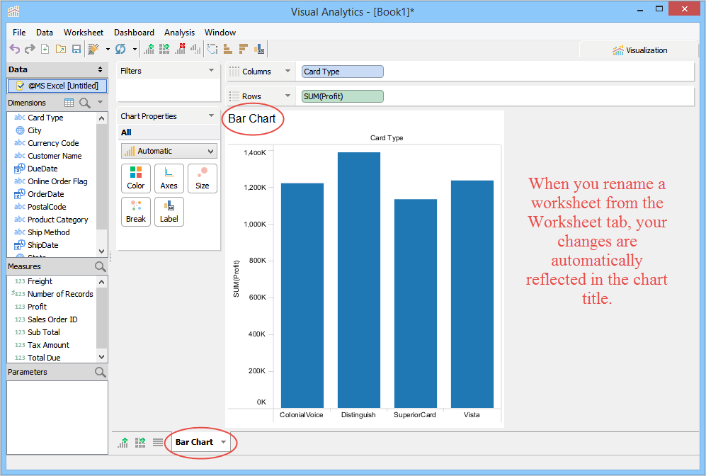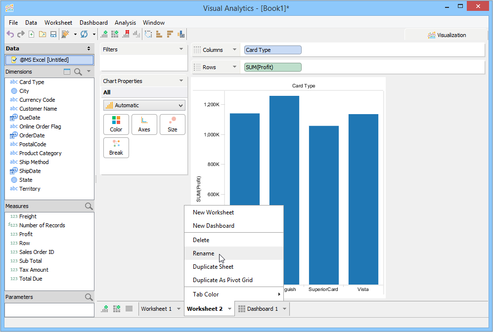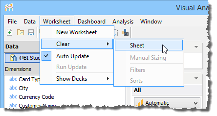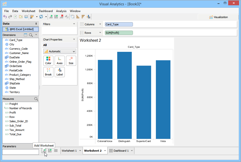 When you launch Visual Analytics for the first time, it automatically generates a sheet labeled "Worksheet 1” and displays the sheet name as the chart title in the chart view. This sheet name can be edited, formatted, and shown or hidden from the chart view. For more information, see Chart Title. If you want to create additional sheets, perform one of the following steps.