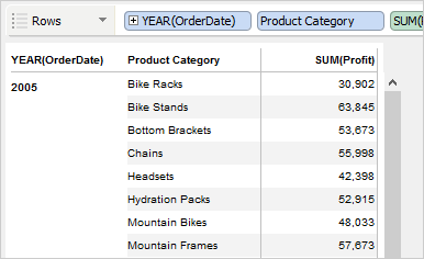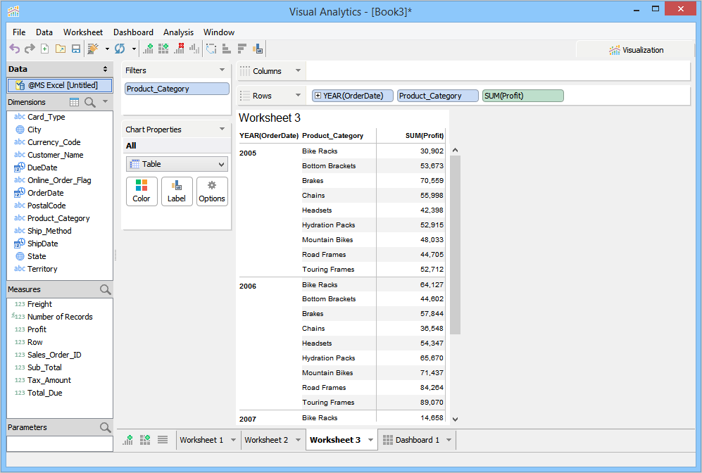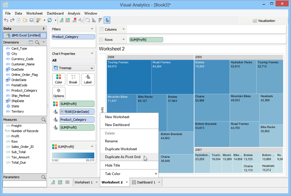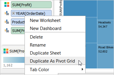 To create a pivot grid view, Visual Analytics moves the dimensions or measures from the Chart Properties Deck to the Rows or Columns Deck. You can duplicate a chart as a pivot grid by right-clicking the Worksheet Tab, or by clicking the Worksheet menu > Duplicate As Pivot Grid.