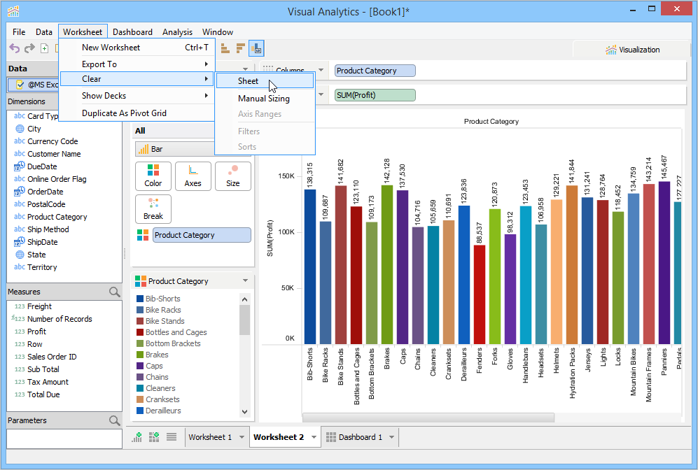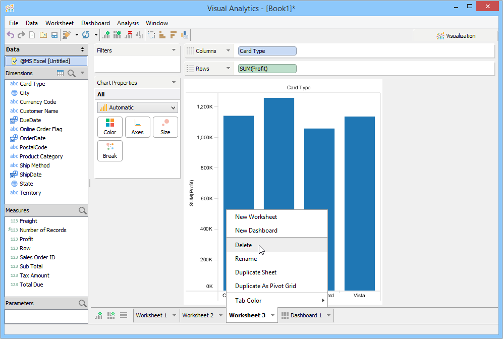 A Sheet is where you create Views by arranging data with drag and drop by placing Dimensions and Measures into decks. Each sheet, whether it's a Dashboard or Worksheet, is displayed as a tab at the bottom of Visual Analytics.