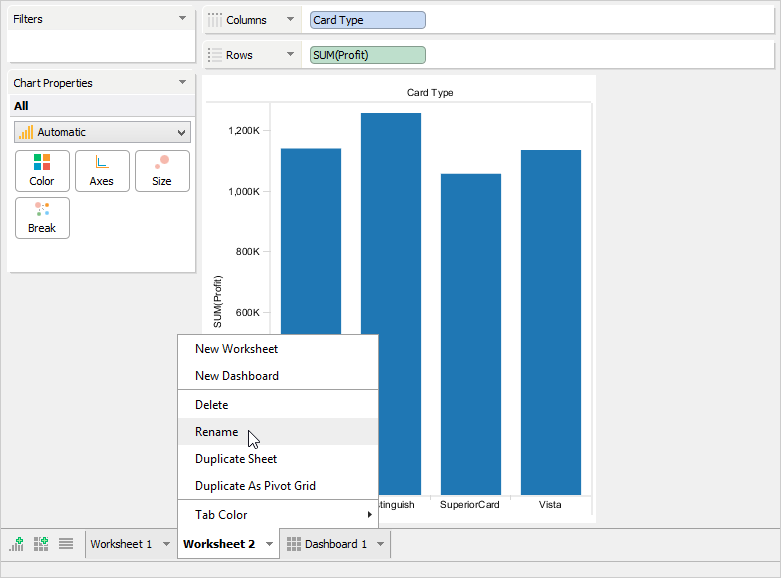 To duplicate an existing Worksheet or Dashboard, left click its tab and select [Duplicate Worksheet]. This is useful for making a copy of your work so you can make modifications on existing views without altering the original content.