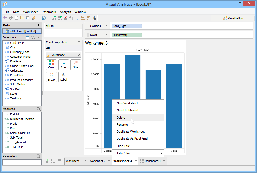 To delete a Worksheet or Dashboard left click on its tab at the bottom of the Visual Analytics and choose [Delete].