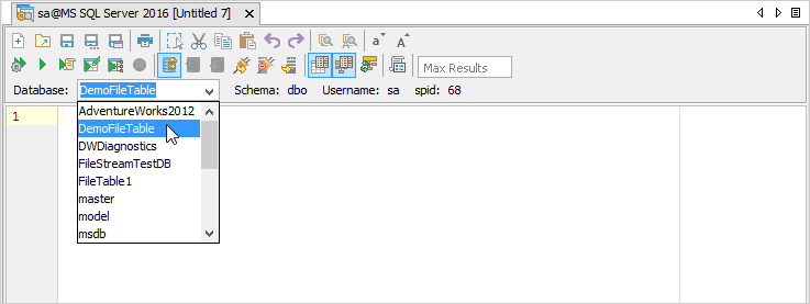 Click here for a diagram of the toolbar button functions Toolbar Functionality The toolbar allows you to create a new query, open scripts, save scripts, save results, copy content, cut content, paste content, undo, redo, find, replace, change case, parse, execute, execute current, execute edit, execute explain, stop execution, auto-commit, commit, rollback, reconnect, enable auto-completion, refresh the auto schema, run a parameterized script, and set the maximum results displayed. You can change the database you are analyzing in the drop-down menu above the edit window.