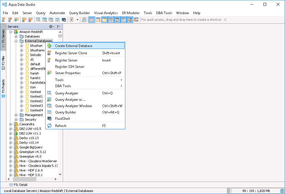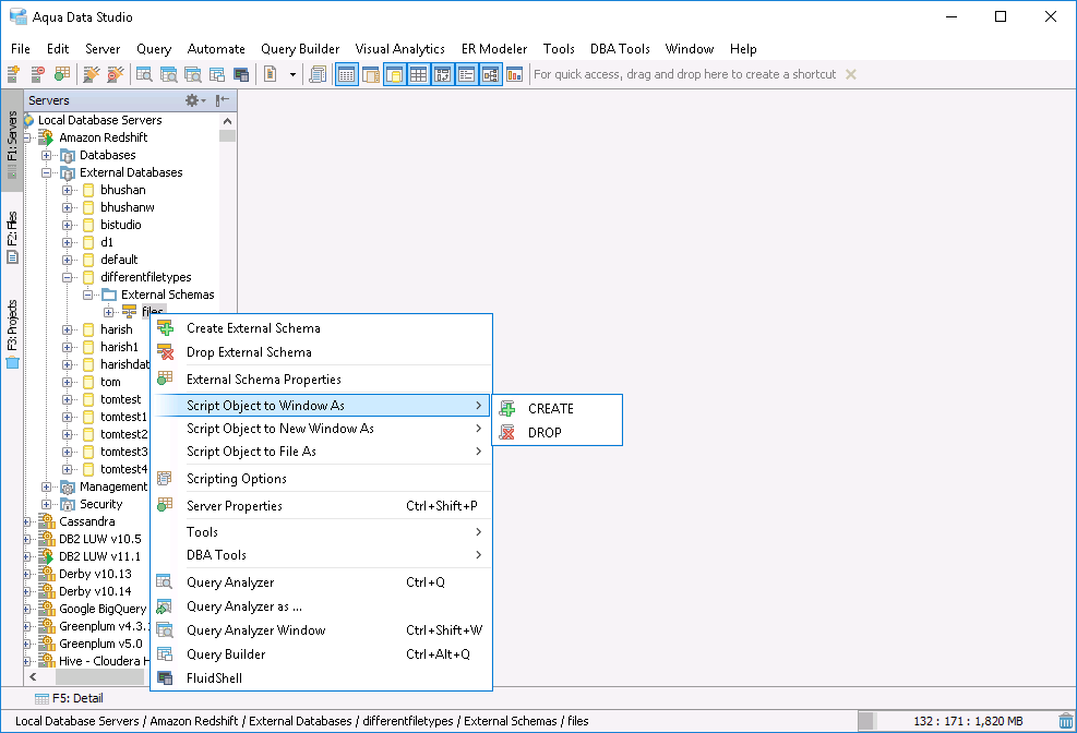The Schema Browser functions as a navigational aid for database administration and query editing. It also assists in organizing SSH Servers (see the SSH Browser for more information on expanding and collapsing SSH Servers in the tree). Server Groups, servers, and connections can be renamed and dragged and dropped to organize them. Context sensitive menus are accessible inside the Schema Browser through right-clicking on schema objects or keyboard shortcut (ALT + DOWN ARROW) once an object is selected. The Schema Browser can be docked or undocked as an individual panel as part of the Workspace and Docking Framework of Aqua Data Studio. A tree is used to display database server objects, allowing for rapid location of schema objects. When an object is selected in the Schema Browser, the Detail View displays contents or status. Icons for database servers change to indicate whether server connections are connected (green triangle), disconnected (orange vertical bars) or failed (red block) in the Schema Browser. The icons for server type also vary based on if they are Production (gold gear), Development (gray nodes) or Test (blue bug) servers.