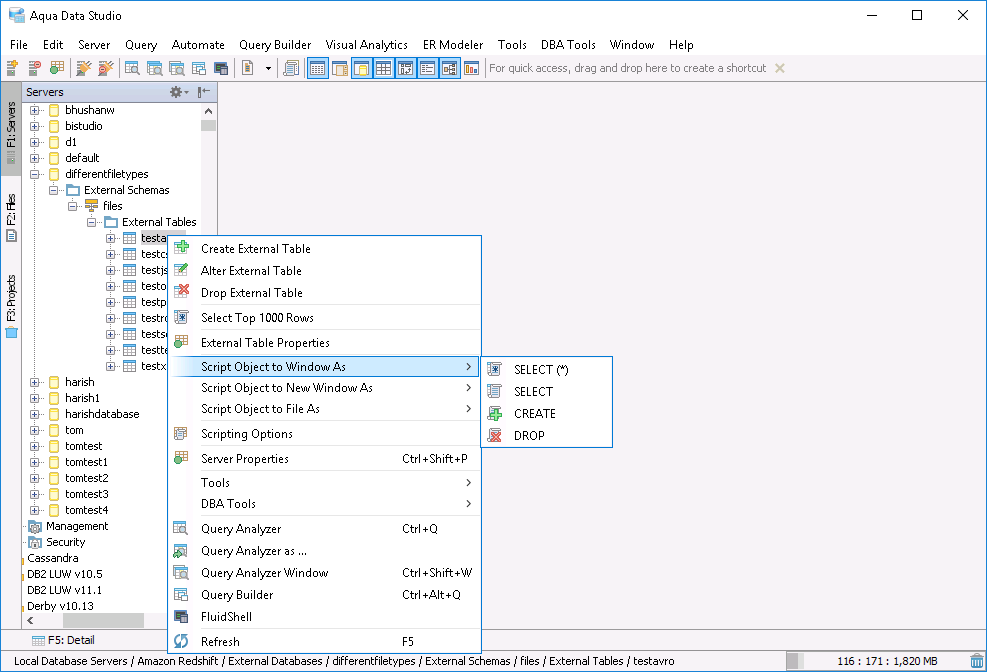 Both External Schemas and External Tables have the Create, Drop, Properties and Script Objects options when you right-click on them.