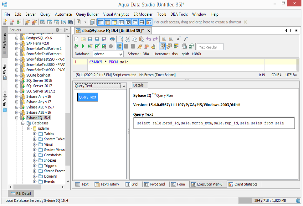 Execution Plan for Sybase IQ 15.x and Sybase IQ 16.0 When executing a query it is possible to view Execution Plans for Sybase IQ 15.x and Sybase IQ 16.0. Once the query executes and the Execution Plan Results Tab is viewed, there are three possibilities for viewing: