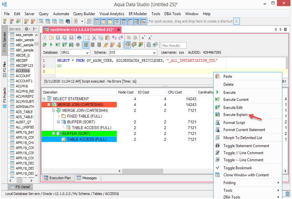 Aqua Data Studio’s Visual Explain provides visual display of an execution plan for a query, allowing for query tuning to enhance query and server performance. ADS provides a "Show Execution Plan" option in the Main Application Toolbar. If this option is enabled an execution plan will be generated for each query executed in the results Execution Plan tab. Multi-execution plans are supported and executing a script will generate multiple execution plans. Aqua Data Studio also provides an "Execute Explain" button in the query window which will generate an execution plan for the current query or the highlighted queries in the Query Analyzer window. The visual explain plans have an identical layout for most databases except for the row information for each node operation, which contains specific column information according to the specific database server and version. There are two ways that ADS can be used in comparing execution plans of queries. The first option is to "Execute Explain" on two highlighted queries at the same time, which will give you two visual explains in the results to compare. The second option is to open two popup Query Windows and execute a single query in each window to be compared side-by-side. Before you begin using visual explain you may want to review the default settings according to your database vendor and version. You may change the settings in the File > Options > Explain tab. It is also possible to add execution plans to the Visual Explain Whiteboard. Right-Click on the contents of the Execution Plan to add that Plan to the Explain Whiteboard for quick comparison of execution time from multiple queries in one window. Explain Diagrams can be generated from Execution Plans and saved as JPEG or PNG images for sharing. Each operation's details can be viewed and the color of critical operations can be altered to assist in highlighting important bottlenecks and steps in the execution process. Diagram objects can be repositioned to create meaningful images for others. Microsoft SQL Server does not have any configurable settings and works from installation by only enabling the execution plan. For Oracle, the default settings should also work from installation. ADS will create and drop an explain table every time the user executes a query or executes explain with a dynamic explain table name using the session id, so the explain tables are not confused by simultaneous users. If you would like to manually configure and create an explain table for all of your users, you may do so and have all ADS users configure their ADS installation to access that specific table. DB2 should also work out of the box, which by default will create the explain tables if they do not exist but will not drop them. The reason for the different configurations for the 3 different databases is because of the different implementations by the database vendor. Microsoft SQL Server’s explain plans can be easily enabled by issuing an SQL statement which will return explain plan result-sets. Oracle allows a user to execute an EXPLAIN statement which provides an option to place the explain data in an explain table of the user’s choice. DB2 also provides an EXPLAIN statement which will only insert data into a defined explain plan table. The issues arise in supporting explain plans for concurrent users. The ADS Oracle and DB2 LUW explain implementations will create explain data in the explain tables identified by a Globally Unique Identifier (GUID) and a statement id to ensure concurrency. ADS supports execution plans for Oracle, DB2 LUW, DB2 z/OS, Microsoft SQL Server, MariaDB, MySQL, PostgreSQL, Redshift, Greenplum, ParAccel, Teradata, Teradata Aster, Netezza, Sybase, and Hive, Spark and Impala distributions. Oracle and DB2 support explain plans through explain tables, and Microsoft SQL Server supports them through returned result-sets. The Visual Explain Plan offers insight into the execution of SQL Statements and helps the user isolate potential performance bottlenecks. Each operation (Join, Sort, Index Scan, etc) is displayed with statistics about the resources required to perform the task. When enabled, coloring of operation costs mark bottleneck issues.The Explain Plan grid has several right-click pop-up menu options for viewing the results in different ways and highlighting areas of interest: