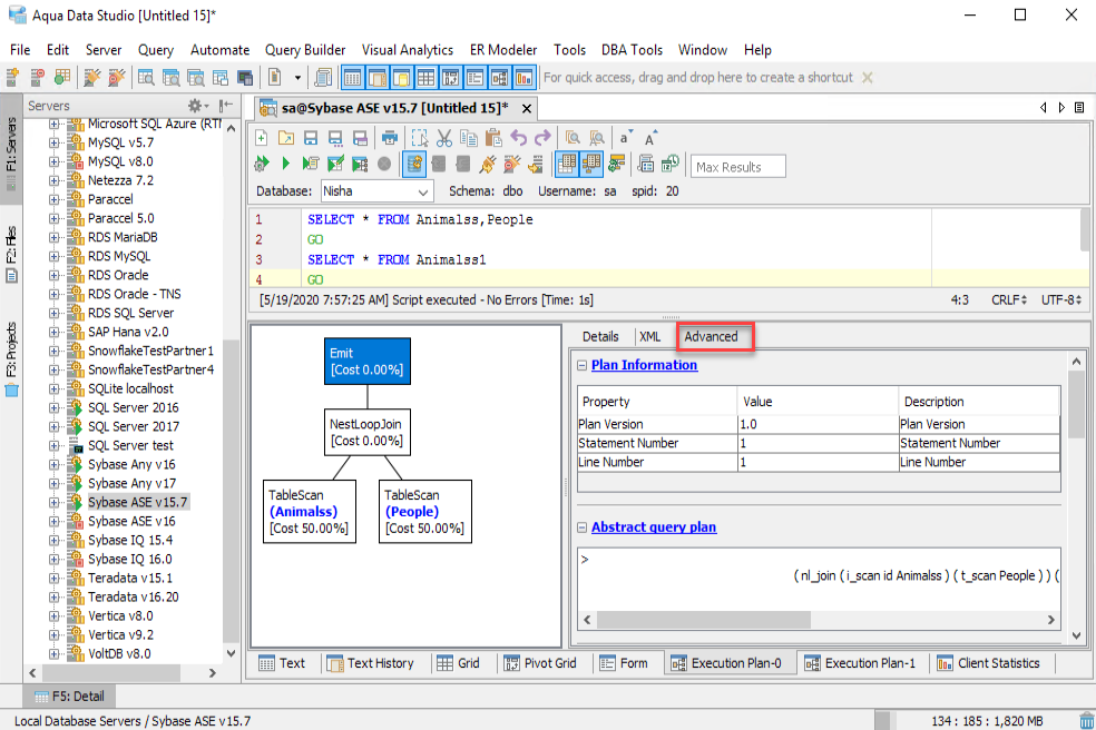 Explain Plan for Sybase 12.5, 15.x and 16.x When executing a query, it’s possible to view Execution Plan for Sybase 12.5, Sybase 15.x and Sybase 16.x as TEXT or XML based on the type selected in File > Options > Visual Explain > Sybase ASE Visual Explain Plan. Explain Plans are available by executing an explain by clicking the "Execute Explain Plan" button in the Query Analyzer toolbar, and by enabling "Show Execution Plan" for Results in the Main Application Toolbar when running a query in a regular fashion. TEXT Explain The TEXT Explain option displays a text formatted version of the explain plan, with an associated Explain grid underneath it. There are columns within the grid for Total Logical Reads, Total Physical Reads, Scan Count, Regular Reads Logical, APF Reads Logical, Regular Reads Physical, APF Reads Physical, and APF IOs. The query will not be executed when the "Execute Explain" button is used. XML Explain With the XML Explain option selected, the Explain Plan displays a diagram that allows clicking nodes to view details for those nodes in the Details tab. Mouse hover over nodes also produces a tool-tip containing statistics for that node. The query will be executed when the "Execute Explain" button is used. Important: Keep in mind that executing an explain in the XML Explain mode on an INSERT, UPDATE or DELETE statement will affect your data. The Details tab displays information about the currently selected node in the Diagram, including information on: