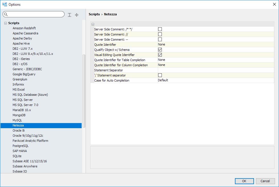 Scripts and Results Options determine settings for scripts (including server side comments, quote identifier and statement separator settings) and Query Results display settings (including data type formatting).