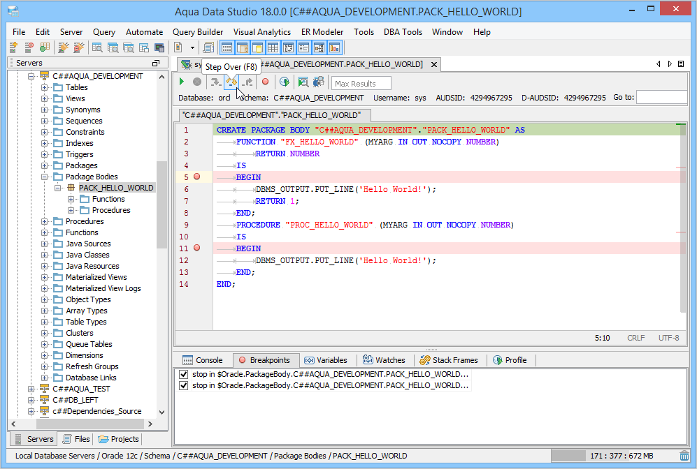 The Oracle SQL Debugger has been designed to help with testing and debugging of SQL functions and procedures for Oracle versions 9i and above. Launching the Oracle SQL Debugger The Oracle SQL Debugger is launched through a right click in the Schema Browser on Stored Procedures or User Defined Functions and selecting Debug from the popup menu. More than one debugger can be open at once, with each object to be debugged opened in a separate tab. Debugger Workspace The debugger displays a slightly modified version of the Query Analyzer Toolbar containing debugger specific menus and buttons. Along the top of the debugger are the Execute, Stop, Step Into, Step Over, Step Return, Toggle Breakpoint, Turn On Profiling, Target Query Window, Debugger Query Window buttons. Next to the buttons is the Display Max Results input field. Beneath the buttons is the connection information, username and SID information. The procedure or package displays in the debugging window, within which breakpoints can be added by right clicking and selecting "Toggle Breakpoint" from the popup menu. When this window has focus, and a line has been clicked, it is also possible to select "Run to Cursor," to run the debugger up to that line in the procedure. From the same popup menu, "Go to Current Line" brings the cursor to the current line, which is very useful when debugging multiple lengthy procedures. Below the debugger window are tabs for Console, Breakpoints, Variables, Watches, Stack Frames and Profile. The Console tab displays any errors or messages generated as debugging progresses. The Breakpoints tab indicates the lines of the procedure where breakpoints are set and allows them to stop execution or not. The Variables tab lists any variables by name, their value and type. The Watches tab allows selecting specific variables to be observed as they change, reducing from a possible list of hundreds to a select group. The Stack Frames tab lists the local variables of the functions, and the arguments to them. The Profile tab lists commonly used terms or values a user works with on a regular basis in the debugging process. Once execution of a procedure has begun through the use of the Start button at the top of the debugger window, the bottom left of the window is occupied by the Text, Text History, Grid, and Pivot Grid Results tabs. This area functions just as the Query Analyzer window does, revealing the results of procedures at each breakpoint or execution cursor. The Oracle SQL Debugger features include: