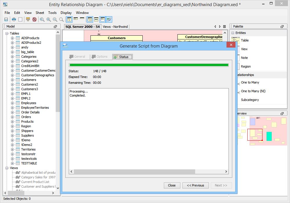 Scripts can be generated from the content of the ER Modeler (Forward Engineering), allowing conversion of the diagram into database commands and DDL. The resulting DDL can be imported via Aqua Data Studio's import command into another database, or saved and shared as an SQL script. Generating Scripts from an ER Model works nearly the same as generating a script through right click on an object in the Schema Browser, and selecting "Schema Script Generator." Generating a Script from an ER Model 1. Select "Generate Script" from the Tools Menu in the Menu Bar, or use the keyboard shortcut CTRL + SHIFT + G. 2. Select what database, schema, and schema objects are to be generated from the diagram. Use the quickfilter to focus a search to key words or wildcards. Individual Object Types ( Tables, Views and Indexes) and individual Objects can be selected. Click next. 3. Modify the Options for the script. Save as a single file, one file per object, or choose to preview the script without generating any files. Choose the script location, encoding, platform, statement separator, object quoted identifier, CREATE generation, DROP generation, Include Descriptive Header, Include Blank Line Between Statements, Include Comments, Qualify Objects, and other options. Click next. 4. View its status for errors and elapsed time as the script is being generated. If the script generated successfully without errors, click close and browse through the operating system to the destination directory selected above to find the file. If "Preview" was selected in the "Save As" option, the Preview tab will open containing the resulting script with syntax highlighting as set under File->Options->Editors->SQL Editor The generated script contains all of the database commands needed to generate the diagram within a database.