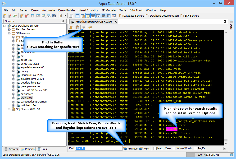 Aqua Data Studio includes a SSH Environment - an interactive Unix-like command line interface. SSH is used for remote login and secure communications with remote servers over unsecured networks. The SSH interface is integrated in the IDE and utilizes all Aqua Data Studio GUI capabilities such as a tabbed window interface, customized tabs, search functions, keyboard mapping, docking framework and Shortcut Toolbar shortcuts. Advanced Server Properties also allow the use of Private Key Authentication. Registering a SSH Server This is very similar to how database servers are registered. Once you have installed Aqua Data Studio you will need to register your servers before you get started. There are two methods of registering ssh servers, both of which launch the Register SSH Server dialog