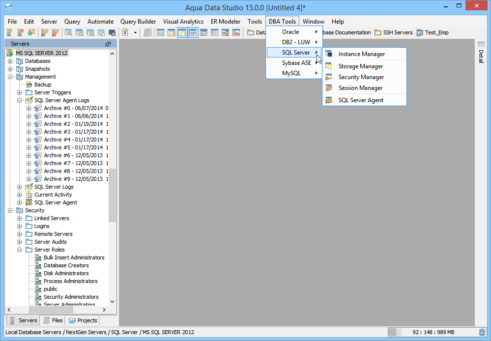 MS SQL DBA Tools The MS SQL Database Administration (DBA) Tools provide users with the tools to administer, manage and monitor all aspects of a MS SQL database. The tools may be accessed from the application DBA Tools menu or from the schema browsers context sensitive popup menu. The following is a list of tools provided with a description of each tools functionality.