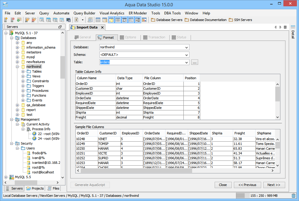 If you want to import files that contain a Binary Large Object (BLOB) data type, make sure to enable the option Convert binary to hex. 1. Select Tools > Import Data from the Menu bar. This will prompt you to choose a server in which to import data. Navigate and select your server and click ok. This will bring up the Import dialog. It is also possible to right-click within the schema browser and select Tools > Import Data to launch the Import Tool. 2. The first tab in the Import Data dialog window is the General Tab. Browse and select the file to import. Once the file is selected a sample of the file will be displayed in the bottom grid to indicate how it will form columns on import. Then, select the encoding and platform the file is formatted in. The sample columns will be refreshed as the options are changed. Select whether the file is delimited or has fixed width columns. If the file has fixed width columns, type the widths of columns separated by commas (eg: 15,25,35,60 ). While typing the column widths the sample data will not change, so make sure to click on the Fixed Width radio box to refresh. Select whether the first row in the file contains the column names to help the import tool map to the table. Last, select the quote identifier for data values. Make sure the sample data being displayed is formatted correctly before proceeding, then click next. 3. In the Format Tab, select the database, schema, and table in which to import the data. To import into a new table, click on the "..." button which will open a Create Table dialog (see the Create Tables page for more) with the columns defined in the sample file. If needed change the names and datatypes of the columns in the table and then click ok. At this point, it is possible to import into the newly created table. If the sample file contains the column names of the values, Aqua Data Studio will make an attempt at matching the column names of the import file to the names of the columns of the table. It is possible to reorder the column mapping by changing the Position column value to match the column number in the sample file or remove the position value to exclude the column from being imported. Once all columns are mapped, click on Create in the left upper corner of the Create Table dialog. This will take you back to the Format dialog (with your table details appropriately adjusted). Continue by clicking the Next button. 4. In the Options Tab begin by selecting whether "(null)" text values are to be converted to NULL values. Then, select the format of the dates & time. Date and time values will be formatted in the text file to be imported into date/time columns. If a date string is to be imported into a VARCHAR column then the format does not apply. There is an option to import directly into the database or generate an SQL file with INSERT statements to import into the database. A sample of the file's values is provided below for configuring the date/time formats. When ready, click the Next button to import the data. If the Import Tool is being used to generate a script file for use in Aqua Data Studio's Query Analyzer, it is strongly suggested that the statement separator "GO" be selected. 5. In the Transaction tab select the type of transaction, Batch Size, Threshold and/or Wait Time that best suits your environment. By default, Transaction Type is set to Full so that the Import takes place in a single transaction. The Transaction Type of Batch allows indicating a specific number of records per transaction by entering a number in the Batch Size field. The Transaction Type of Threshold allows executing a specific number of transactions within a specified number of milliseconds as indicated in the Threshold field. Wait Time is used to pause between transactions, and, if set to -1, will not wait between transactions.