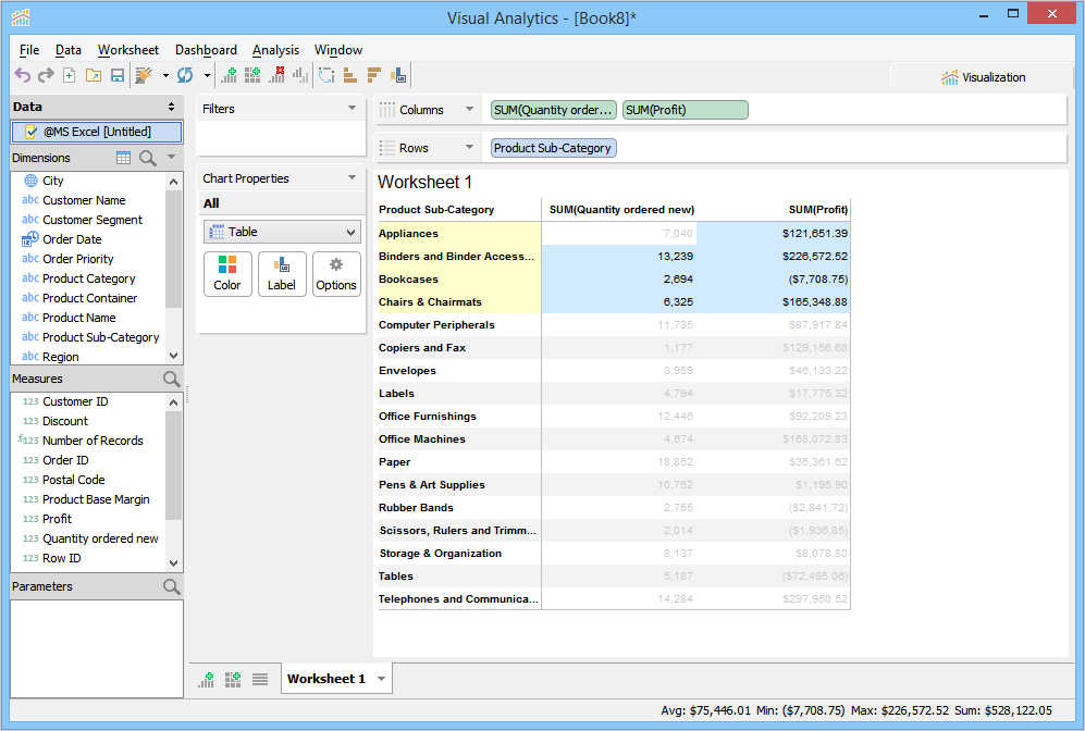 The status bar at the bottom of Visual Analytics window displays built-in aggregate functions when two or more segments are highlighted. By default, Visual Analytics only displays the sum of numerical values for the highlighted segments. To choose more functions, right-click on the status bar and then click the desired functions.