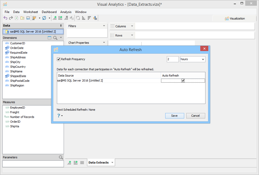 When [Data > Auto Refresh...] is enabled, any data sources which are set for Auto Refresh that contain extracts will also have their extracts refreshed automatically using the Refresh Frequency (seconds, minutes, hours) you have input. See Auto Refresh on the Refreshing Data page for more.