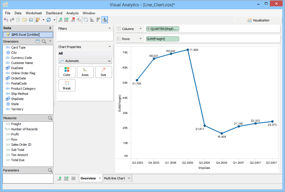 A simple Line Chart can be created when a Dimension is placed in the Columns deck and a Measure is placed in the Rows deck.