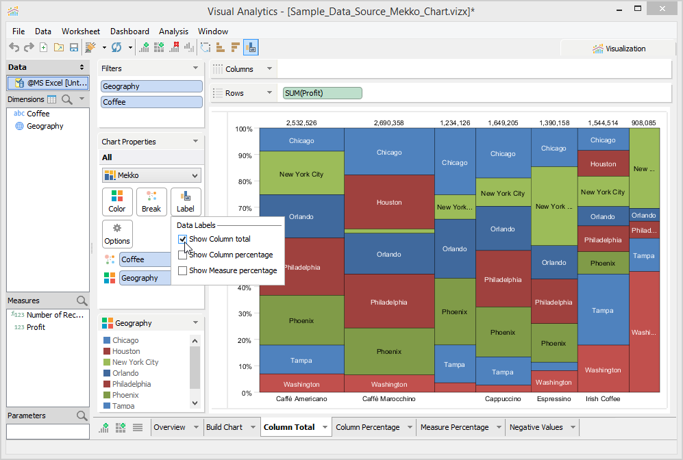 When you enable the Show Column total check box, Visual Analytics displays the total profit of each coffee brand across cities on top of each column.