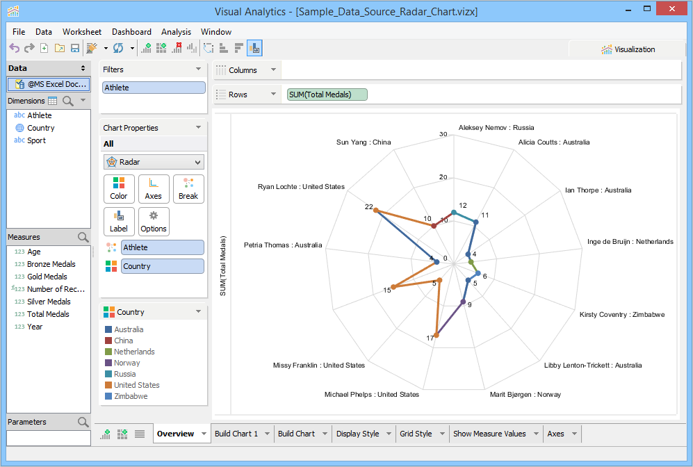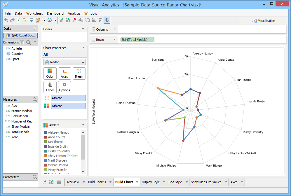 Visualization moves Athlete from the Columns Deck to the Break Deck. Visualization is displaying the athlete names on the chart. If you click the Label Deck, Show Category Labels are selected by default. As the data appears in a spider pattern, it is easy to interpret that Ryan Lochte dominates the medal tally.