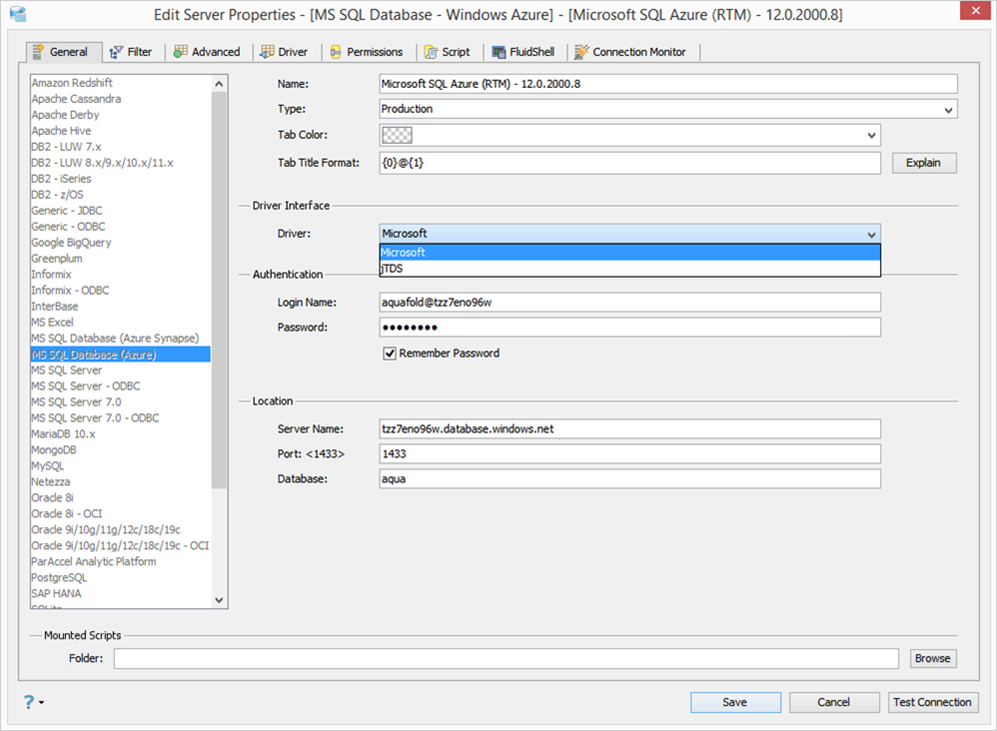 From the Driver drop-down list, choose the driver using which you want to connect to the server. You can choose jTDS or Microsoft JDBC driver and view its details in the Driver tab.