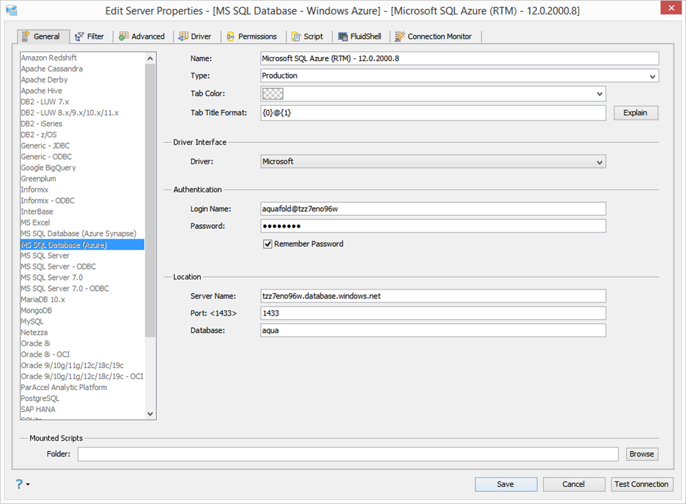 Edit Scripts in Server Properties in Aqua Data Studio: