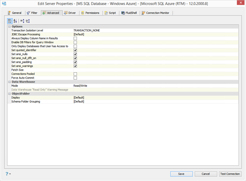 Edit the Server Properties to use Advanced Properties in Aqua Data Studio: