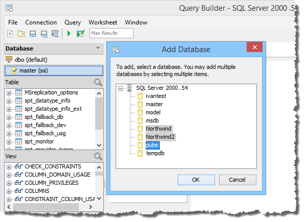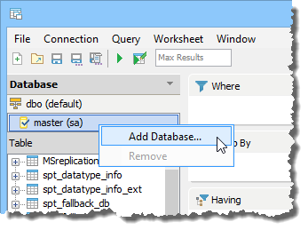 To add multiple databases from the same registered server to your Query Builder Worksheet, click the triangle at the top of the Data Pane and select [Add Database...] For servers that only allow connection to a single database, but do allow multiple schemas, this menu will display [Add Schema...].