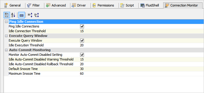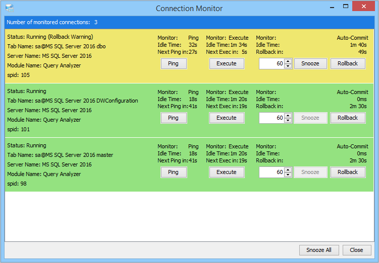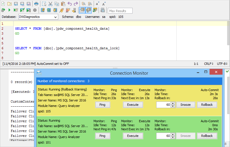 Users working in a production database environment frequently disable the auto-commit option when executing queries. Only after reviewing their query results, do they manually choose to rollback or commit the final result. Since rollback and commit operations are manual tasks, hectic work schedules might lead to having open transactions on a production database for an extended period. This may cause production issues for Database Administrators and other users using the production servers. By enabling the monitoring of the auto-commit disabled setting, the connection monitor will check to see how long auto-commit has been disabled and if the idle threshold has been exceeded then it will set the auto-commit to true. The user may also configure a warning threshold so that the connection monitor may warn the user of turning on auto-commit before it happens and provide the user a snooze option.