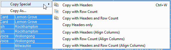 | Copy with Headers and Row Count (Align Columns) | Copies column headers, row counts, and data and retains the column alignment in the destination file. See Attachment. |