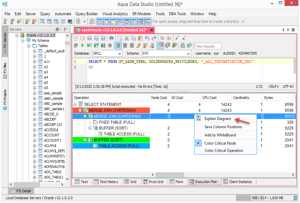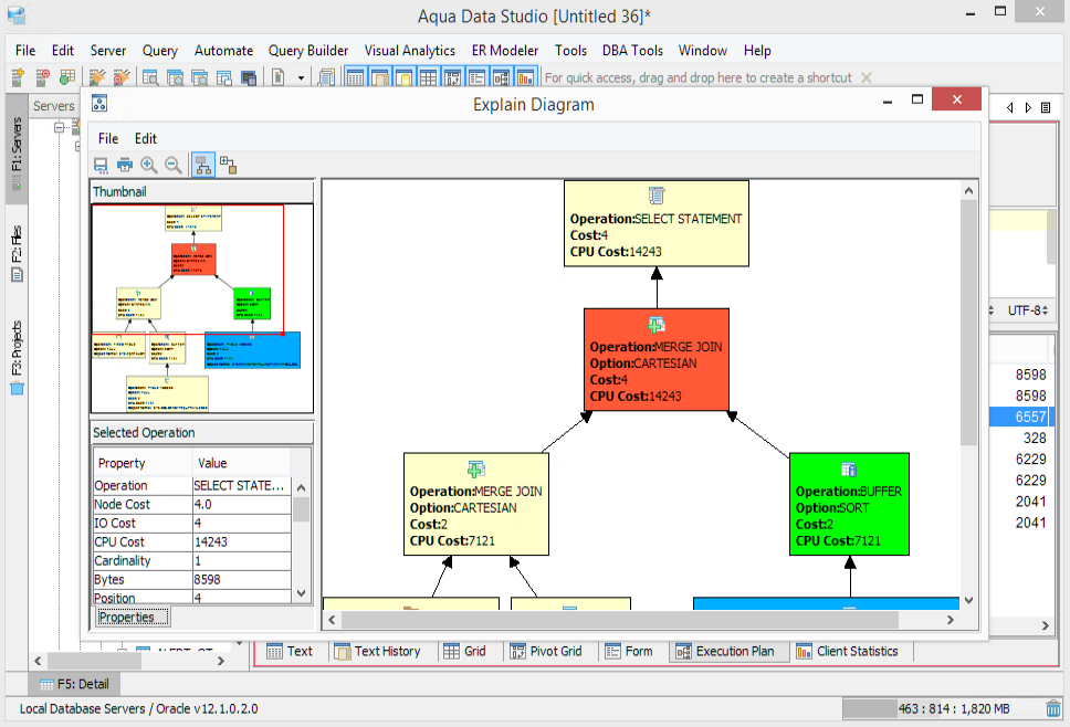 The Visual Explain Diagram in Aqua Data Studio offers a modifiable graphical illustration of an explain plan results. The operations are rendered as a tree of nodes, with the most significant elements colored according to the percentage cost relative to the entire statement. The Thumbnail view at the top left of the window underneath the save as and print icons gives a bird's eye view of the diagram. Stretching and resizing the red outline within, it pans and zooms the diagram. Underneath the Thumbnail view are the Selected Operation execution statistics details displayed for the currently selected diagram object. The size of nodes in the diagram is altered by selecting a node with a left-click and stretching its handles. Nodes may be repositioned by dragging them to a new position. The Zoom In and Zoom Out magnifying glass icons at the top left of the above diagram pane are useful for focusing on specific nodes. Use Visual Explain Diagram to quickly identify areas of your SQL statements which may require tuning. See the Example Query Tuning Demo for a real-world scenario. With the Visual Explain Plan Diagram, it is possible to: