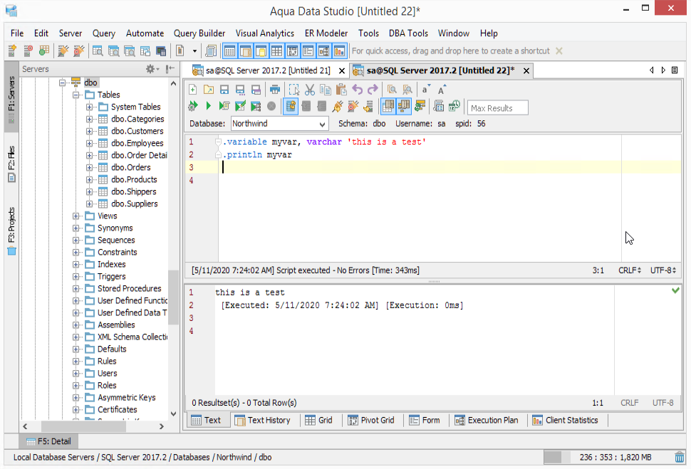 Query analyzer scripts have support for 9 client side commands which allow you to execute a stored procedure with local variables bound to the parameters. See the AquaScripts and AquaProjects Section for much more complex scripting capabilities. This allows for the execution of procedures with OUT parameters. The commands include print, println, variable, executeCallableQuery, sendMail, saveResults, saveLastResult, setResultSettings, and setPivotResultSettings. Client side commands are identified by a dot at the beginning of the command line, and multiple commands can be executed within one batch statement. The schema browser contains object scripting for procedures and functions that include "EXECUTE" and "EXECUTE BIND". The script EXECUTE will generate the appropriate code needed to execute the object according to the database procedural language (ie. PL/SQL, T-SQL). The EXECUTE BIND will generate the appropriate Aqua Data Studio client side commands to execute the object. To easily generate the needed client commands to execute a procedure or function, you may browse in the schema browser to locate the procedure or function and right-click on the object to select "EXECUTE BIND" from the Script Object menus. Command support Query Analyzer scripts have support for client side commands ".sendMail", ".saveResults", ".saveLastResult", "setResultSettings", "setPivotResultSettings" which allow users to either save query results in an EXCEL, HTML, XML, or CSV document, or insert them into a table. The 'sendMail' command sends emails using the settings you specify and allows attachments. The 'saveResults' command saves the results of all of the queries in the window, while the 'saveLastResult' command only saves the result for the last query. The 'setResultSettings' command lays out how grid data will be presented. The 'setPivotResultSettings' command lays out how pivot grid data will be presented. Here is a combination example script using .setPivotResultSettings, .saveResults, and .sendMail which runs a query, takes data from that query, lays out, and generates a pivot grid result, saves the pivot grid results to two different Excel files, then emails a message with both Excel files as attachments.