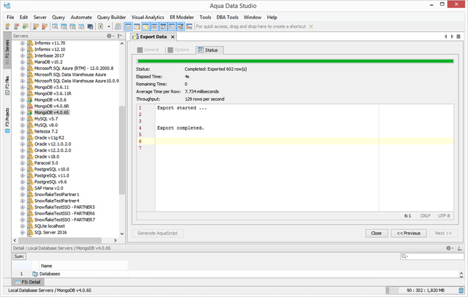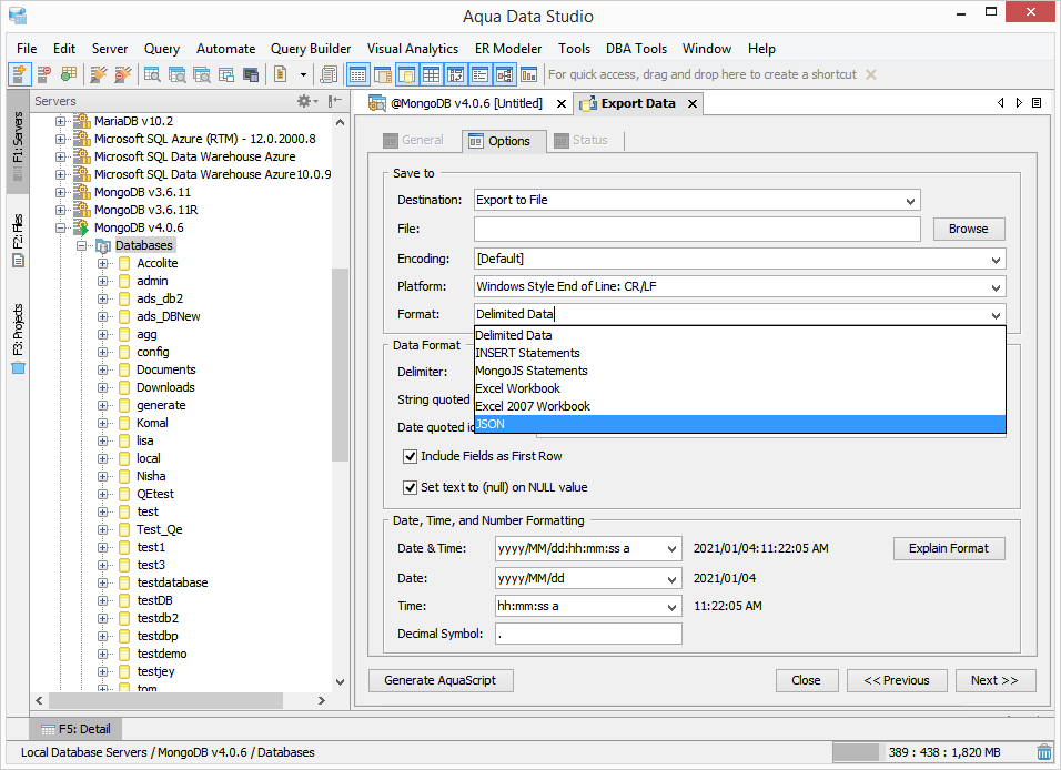 The Export Tool allows data from databases, tables and other database objects to be exported in a variety of formats. The following steps describe how to export data. Export will not work for Generic JDBC or Generic ODBC connections