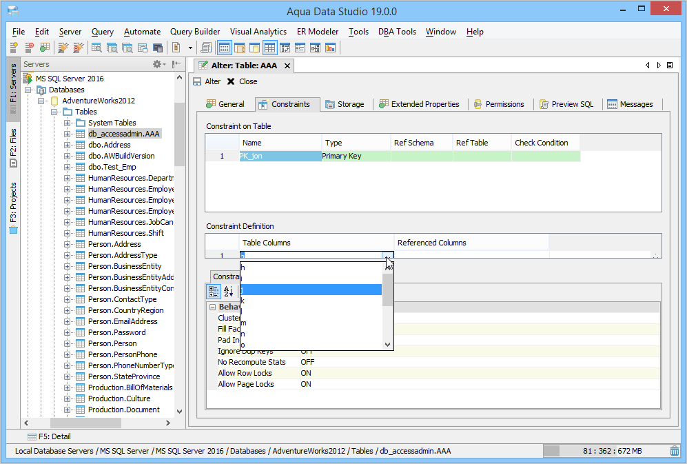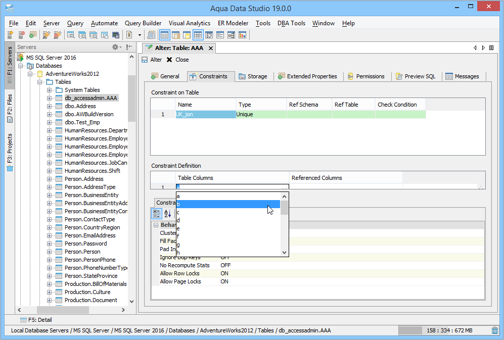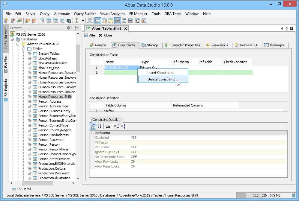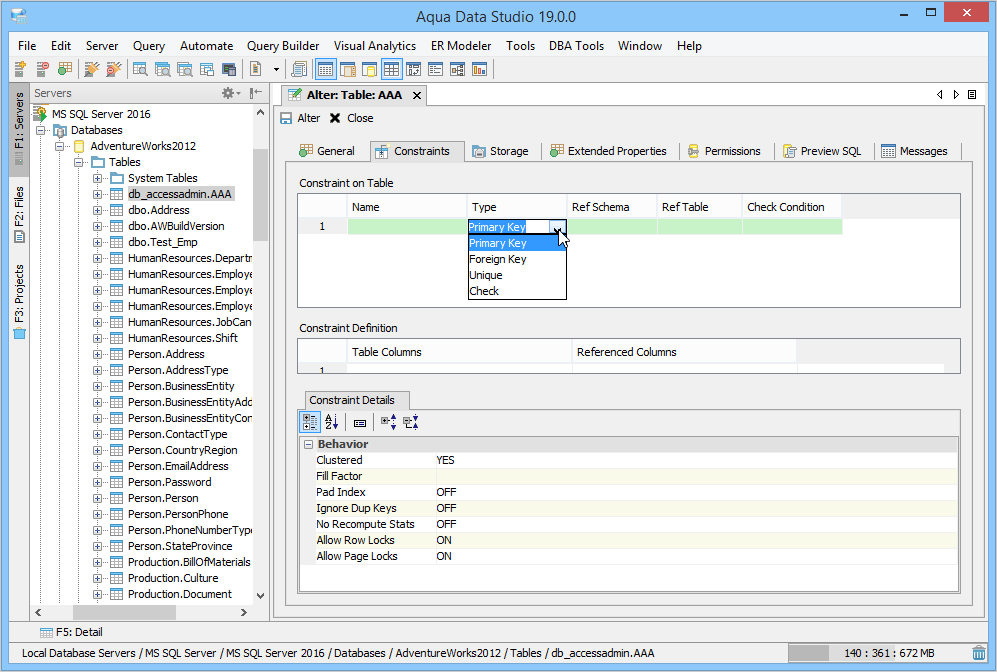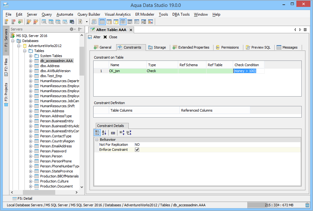 Aqua Data Studio provides visual editors for creating and editing database table Constraint objects. Constraints can be visually edited through the Create Table and Alter Table property windows, launched from a right click in the Schema Browser. Within the Alter and Create Table property windows, the Constraints Tab allows selection and editing of Table Constraints for Primary Key Constraints, Foreign Key Constraints, Unique Constraints and Check Constraints. After constraints have been set in the Constraints Tab, the Preview SQL tab displays the DDL used to generate them. When ER Models are generated from databases in the Schema Browser, constraints are visible within table entity objects. Primary Key Constraints A Primary Key is a candidate key to uniquely identify each row in a table. A table is allowed one Primary Key constraint, and a column that is part of the Primary Key constraint cannot take null values. Because Primary Key constraints ensure unique data, they are most often defined on an identity column. To create a Primary Key Constraint, enter a Primary Key Name in the name column of the Constraints table, then select Primary Key from the Type Column dropdown. In the Constraint Definition pane, select the table columns from the table that are part of the Primary key. A Primary Key Constraint is represented by a table icon with gold node when viewed in the Constraints container in the Schema Browser. Foreign Key Constraints A Foreign Key is a referential constraint between two tables. The foreign key identifies a column or a set of columns in one (referencing) table that refers to a column or set of columns in another (referenced) table. The columns in the referencing table must be the primary key or other candidate key in the referenced table. The values in one row of the referencing columns must occur in a single row in the referenced table. To create a Foreign Key Constraint, enter a Foreign Key Name in the name column of the Constraints table, then select Foreign Key from the Type Column dropdown. Select the Reference Schema and Reference Table. In the Constraint Definition pane, select the columns from the tables that are set in the Reference Table of the Foreign Key. A Foreign Key Constraint is represented by a table icon with gold node and black square when viewed in the Constraints container in the Schema Browser. Unique Constraints A Unique Constraint uniquely identifies all possible rows that exist in a table. Unique Constraints make sure that no identically copied values are entered in specific columns that do not participate in a primary key. Multiple Unique Constraints can exist on a single table. To create a Unique Constraint, enter a Unique Constraint name in the name column of the Constraints table, then select Unique Constraint from the Type Column dropdown. In the Constraint Definition pane, select the columns from the columns needed. A Unique Key Constraint is represented by a table icon with crossed node when viewed in the Constraints container in the Schema Browser. Check Constraints A Check Constraint (also known as table check constraint) is a condition that defines valid data when adding or updating an entry in a table of a relational database. Within the Constraints Tab of Create or Alter Table, the Check Condition column is where the condition is set, determining what the table considers valid data for the selected column. To create a Check Constraint, enter a Check Constraint Name in the name column of the Constraints table, then select Check Constraint from the Type Column dropdown. Enter the formula for the check in the Check Condition field. A Check Constraint is represented by a table icon with gold node and green check when viewed in the Constraints container in the Schema Browser. Sample Table with Constraint Types The screenshot labeled "Table with constraint types" shows the Alter Table dialog for a table from the AdventureWorks database in Microsoft SQL Server 2012. |