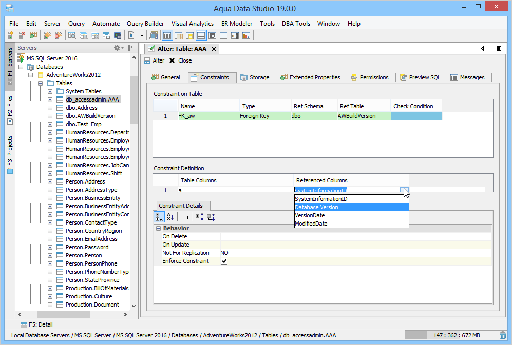 Aqua Data Studio provides visual editors for creating and editing database table Constraint objects. Constraints can be visually edited through the Create Table and Alter Table property windows, launched from a right click in the Schema Browser. Within the Alter and Create Table property windows, the Constraints Tab allows selection and editing of Table Constraints for Primary Key Constraints, Foreign Key Constraints, Unique Constraints and Check Constraints. After constraints have been set in the Constraints Tab, the Preview SQL tab displays the DDL used to generate them. When ER Models are generated from databases in the Schema Browser, constraints are visible within table entity objects. Primary Key Constraints A Primary Key is a candidate key to uniquely identify each row in a table. A table is allowed one Primary Key constraint, and a column that is part of the Primary Key constraint cannot take null values. Because Primary Key constraints ensure unique data, they are most often defined on an identity column. To create a Primary Key Constraint, enter a Primary Key Name in the name column of the Constraints table, then select Primary Key from the Type Column dropdown. In the Constraint Definition pane, select the table columns from the table that are part of the Primary key. A Primary Key Constraint is represented by a table icon with gold node when viewed in the Constraints container in the Schema Browser. Foreign Key Constraints A Foreign Key is a referential constraint between two tables. The foreign key identifies a column or a set of columns in one (referencing) table that refers to a column or set of columns in another (referenced) table. The columns in the referencing table must be the primary key or other candidate key in the referenced table. The values in one row of the referencing columns must occur in a single row in the referenced table. To create a Foreign Key Constraint, enter a Foreign Key Name in the name column of the Constraints table, then select Foreign Key from the Type Column dropdown. Select the Reference Schema and Reference Table. In the Constraint Definition pane, select the columns from the tables that are set in the Reference Table of the Foreign Key. A Foreign Key Constraint is represented by a table icon with gold node and black square when viewed in the Constraints container in the Schema Browser. Unique Constraints A Unique Constraint uniquely identifies all possible rows that exist in a table. Unique Constraints make sure that no identically copied values are entered in specific columns that do not participate in a primary key. Multiple Unique Constraints can exist on a single table. To create a Unique Constraint, enter a Unique Constraint name in the name column of the Constraints table, then select Unique Constraint from the Type Column dropdown. In the Constraint Definition pane, select the columns from the columns needed. A Unique Key Constraint is represented by a table icon with crossed node when viewed in the Constraints container in the Schema Browser. Check Constraints A Check Constraint (also known as table check constraint) is a condition that defines valid data when adding or updating an entry in a table of a relational database. Within the Constraints Tab of Create or Alter Table, the Check Condition column is where the condition is set, determining what the table considers valid data for the selected column. To create a Check Constraint, enter a Check Constraint Name in the name column of the Constraints table, then select Check Constraint from the Type Column dropdown. Enter the formula for the check in the Check Condition field. A Check Constraint is represented by a table icon with gold node and green check when viewed in the Constraints container in the Schema Browser. Sample Table with Constraint Types The screenshot labeled "Table with constraint types" shows the Alter Table dialog for a table from the AdventureWorks database in Microsoft SQL Server 2012. |