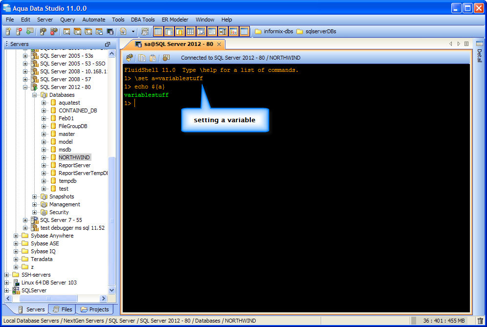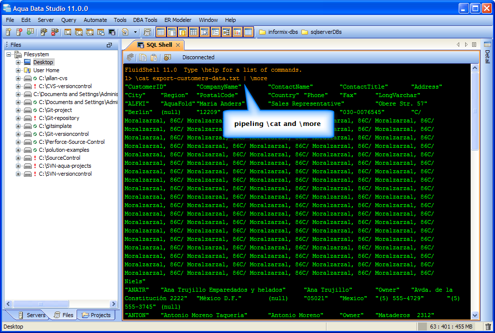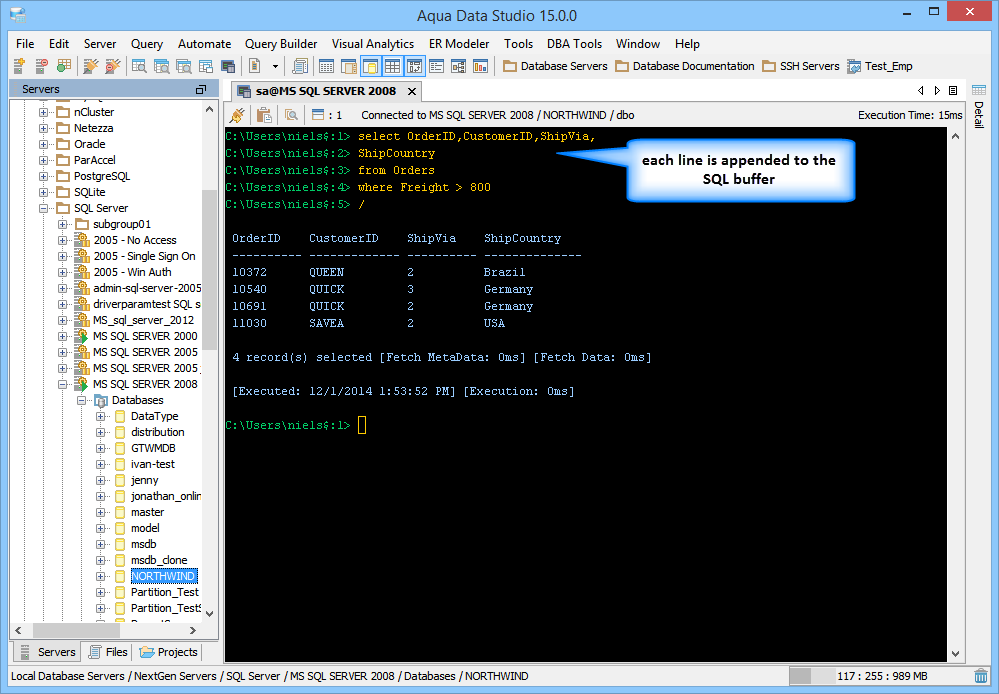 :$ select order_id, product_name, quantity :$ from orders :$ limit 5 :$ go order_id product_name quantity ----------- --------------- ----------- 01012007-72207-847 Aqua Data Studio v6.0 [w/ One Year Subscription] 1 01012007-72207-ROWBOAT Aqua Data Studio v6.0 [w/ One Year Subscription] 1 01012008-72207-14343 Aqua Data Studio v6.5 [w/ One Year Subscription] 1 01012008-72207-1529 Aqua Data Studio v6.5 [w/ One Year Subscription] 1 01012008-72207-BLACKDUCK Aqua Data Studio v6.5 [w/ One Year Subscription] 1 5 record(s) selected [Fetch MetaData: 1ms] [Fetch Data: 0ms] [Executed: 9/11/2012 8:45:15 AM] [Execution: 1ms]