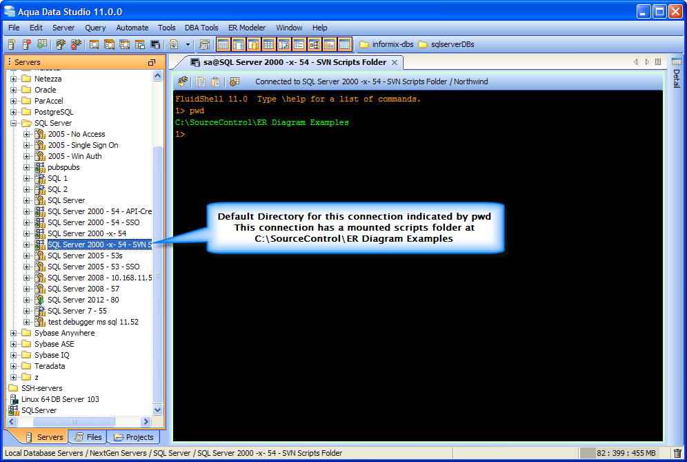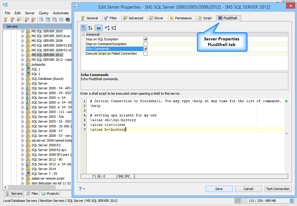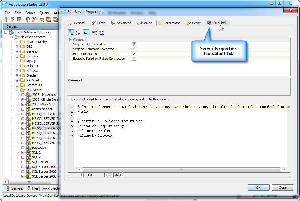Once the new FluidShell is open, it will execute any initialization script. If a FluidShell is open on a specific registered server it will execute the initialization script defined in the server registration in the FluidShell tab. If a FluidShell is open without a registered server it will execute the global initialization script defined in the File > Options > FluidShell > Script. Users may configure their shells environment per registered server or at a global level by issuing any specific shell commands.