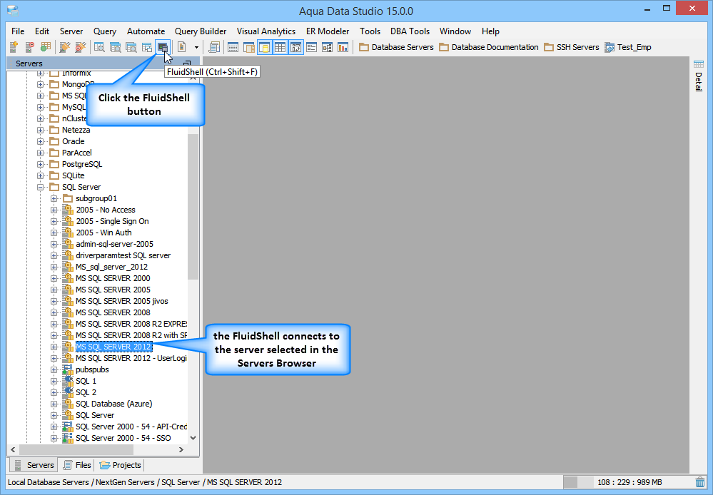 To open a FluidShell window you click on the FluidShell button in the Server application menu or application toolbar with a key binding of Ctrl-Shift-F. When opening a FluidShell, the shell will attempt to establish a default database connection to any registered server the user may have selected in the schema browser. If no server is selected then no default database connection will be established in the newly open shell.