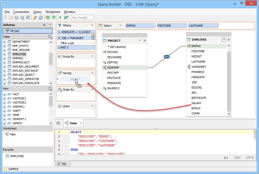 The Visual Query Builder is designed to enhance productivity and simplify SQL query building tasks by allowing dragging and dropping multiple tables, views and their columns in a workbook to generate SQL statements. The Query Builder Workspace contains a Data Pane, decks for SQL clauses, a tabbed Diagram Pane and an SQL Pane. The Data Pane makes it easy to navigate between object types and schemas within a specific database connection. Objects are dragged into and within the Query Builder interface to create SQL based on your database schema, tables, views or columns. Dragging objects from the Data Pane or the Diagram Pane to any of the configurable decks for SELECT, WHERE, GROUP BY, HAVING and ORDER BY SQL clauses writes out the corresponding SQL as you go. Based on what you've dragged into the decks, the visual Query Builder generates a complete SQL statement that can be executed. Features like JOINs, UNIONs, Subquery in SELECT, Derived Tables and the Index Manager save you time and make the process of building queries more powerful and intuitive.