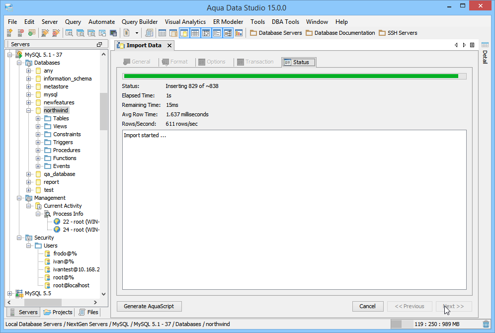 If you are importing files that contain BLOB data types, make sure to select Batch mode in the Transaction tab. 6. Once the Status Tab takes focus, the import has begun. It is possible to cancel the import at any time by clicking on the cancel button at the bottom of the dialog. If any errors or warnings occur, they will be displayed in the message text window. Date and time formats are specified by date and time pattern strings. Within date and time pattern strings, unquoted letters from ’A’ to ’Z’ and from ’a’ to ’z’ are interpreted as pattern letters representing the components of a date or time string. Text can be quoted using single quotes (’) to avoid interpretation. "’’" represents a single quote. All other characters are not interpreted; they’re simply copied into the output string during formatting or matched against the input string during parsing. For more information on how to configure Date, Time and Date/Time formats (including user-customized formatting) throughout Aqua Data Studio, see the Options for Date Time and Date/Time.