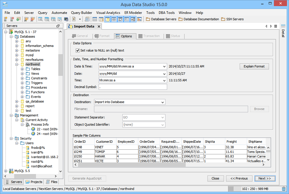 If you want to import files that contain a Binary Large Object (BLOB) data type, make sure to enable the option Convert binary to hex. 1. Select Tools > Import Data from the Menu bar. This will prompt you to choose a server in which to import data. Navigate and select your server and click ok. This will bring up the Import dialog. It is also possible to right-click within the schema browser and select Tools > Import Data to launch the Import Tool. 2. The first tab in the Import Data dialog window is the General Tab. Browse and select the file to import. Once the file is selected a sample of the file will be displayed in the bottom grid to indicate how it will form columns on import. Then, select the encoding and platform the file is formatted in. The sample columns will be refreshed as the options are changed. Select whether the file is delimited or has fixed width columns. If the file has fixed width columns, type the widths of columns separated by commas (eg: 15,25,35,60 ). While typing the column widths the sample data will not change, so make sure to click on the Fixed Width radio box to refresh. Select whether the first row in the file contains the column names to help the import tool map to the table. Last, select the quote identifier for data values. Make sure the sample data being displayed is formatted correctly before proceeding, then click next. 3. In the Format Tab, select the database, schema, and table in which to import the data. To import into a new table, click on the "..." button which will open a Create Table dialog (see the Create Tables page for more) with the columns defined in the sample file. If needed change the names and datatypes of the columns in the table and then click ok. At this point, it is possible to import into the newly created table. If the sample file contains the column names of the values, Aqua Data Studio will make an attempt at matching the column names of the import file to the names of the columns of the table. It is possible to reorder the column mapping by changing the Position column value to match the column number in the sample file or remove the position value to exclude the column from being imported. Once all columns are mapped, click on Create in the left upper corner of the Create Table dialog. This will take you back to the Format dialog (with your table details appropriately adjusted). Continue by clicking the Next button. 4. In the Options Tab begin by selecting whether "(null)" text values are to be converted to NULL values. Then, select the format of the dates & time. Date and time values will be formatted in the text file to be imported into date/time columns. If a date string is to be imported into a VARCHAR column then the format does not apply. There is an option to import directly into the database or generate an SQL file with INSERT statements to import into the database. A sample of the file's values is provided below for configuring the date/time formats. When ready, click the Next button to import the data. If the Import Tool is being used to generate a script file for use in Aqua Data Studio's Query Analyzer, it is strongly suggested that the statement separator "GO" be selected. 5. In the Transaction tab select the type of transaction, Batch Size, Threshold and/or Wait Time that best suits your environment. By default, Transaction Type is set to Full so that the Import takes place in a single transaction. The Transaction Type of Batch allows indicating a specific number of records per transaction by entering a number in the Batch Size field. The Transaction Type of Threshold allows executing a specific number of transactions within a specified number of milliseconds as indicated in the Threshold field. Wait Time is used to pause between transactions, and, if set to -1, will not wait between transactions.