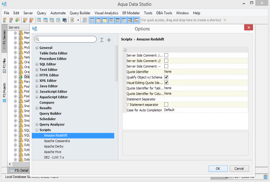 ADS comments are configurable Different databases support different types of comments. By using the Options dialog box, a user may select each type of comment to be a client or a server side comment per database. You can confirm what statement and comments will be executed on the server with an "Execute Parse" on a statement/script before executing. Below is a list of databases, the comment types they support, and the default value for each database. The comments option each database vendor has are available by File > Options > Scripts