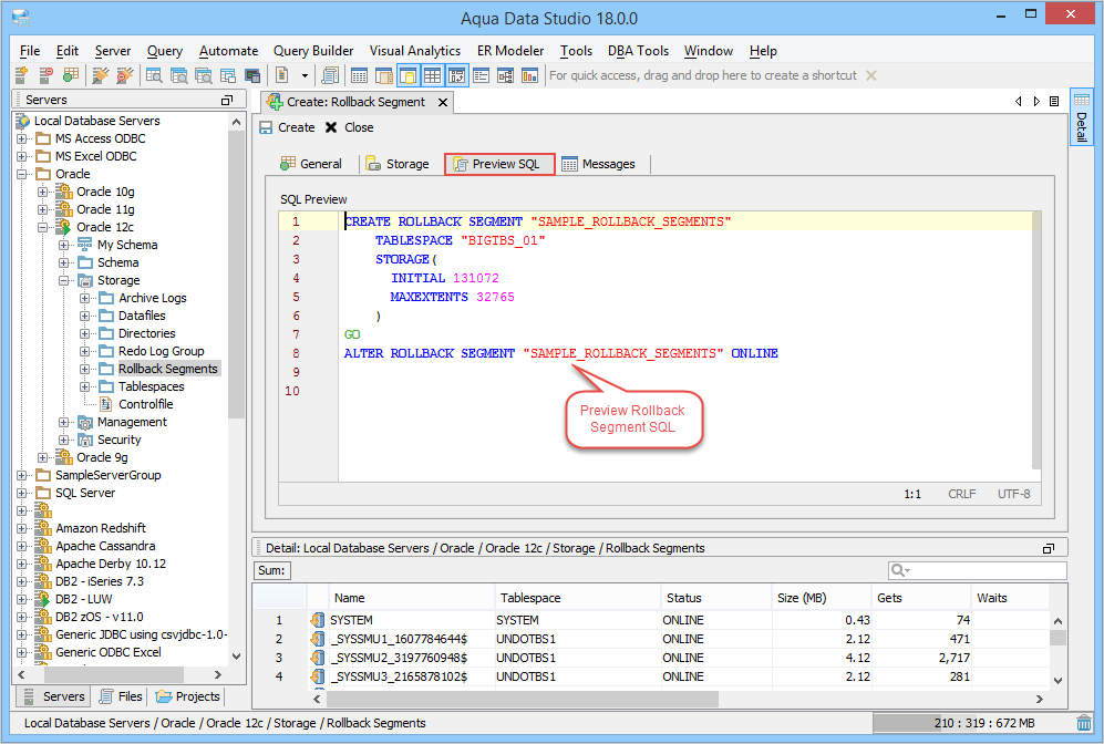 To create Oracle Rollback Segments, connect to an Oracle server and expand the tree to view the Storage container. Right click on Rollback Segments within the Storage container and select Create Rollback Segement. Enter the Rollback Segment name and Tablespace. Select its status as Online or Offline. In the Storage tab Set the Extents Initial Size, Next Size, Optimal Size, Minimum Number and Maximum number. View the SQL in the Preview SQL tab. Click OK to finish.