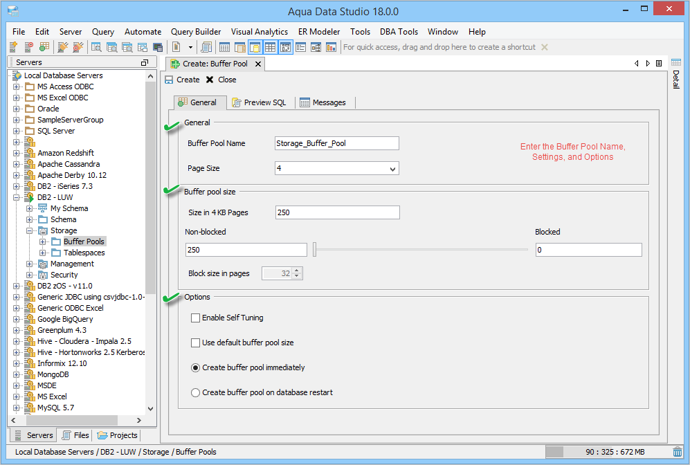 To create a DB2 Buffer Pool, expand the DB2 Storage container and right click on Buffer Pools to select Create Buffer Pool. Enter a Buffer Pool name and select a page size. Under the Buffer Pool Size section, select the size and the number of Non-blocked and Blocked Pages. Select the Block size in pages. Under the Options section choose Self Tuning or Use default Buffer Pool size. Select Create Buffer Pool on database restart or Create Buffer Pool immediately. Preview the SQL in the SQL Preview tab. Click OK to finish.