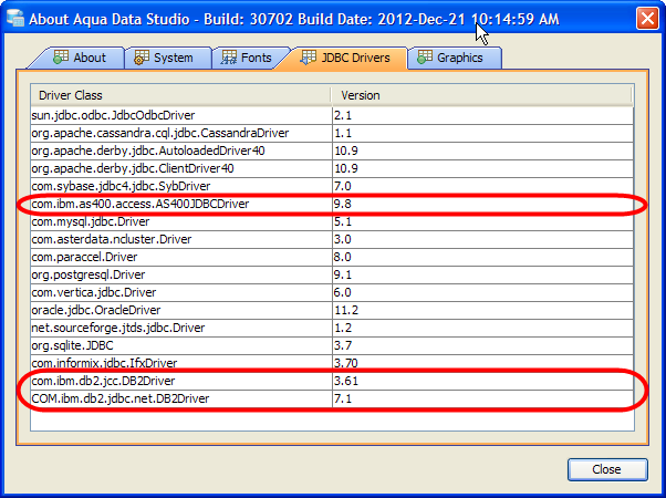 To update the Aqua Data Studio JDBC drivers you need to overwrite the Aqua Data Studio db2java.jar (for DB2 7.2) and/or db2jcc.jar and db2jcc_license_cu.jar (for DB2 z/OS) files. Below is a listing of the Aqua Data Studio library directory [ADS_INSTALL]\lib\drivers\ ...