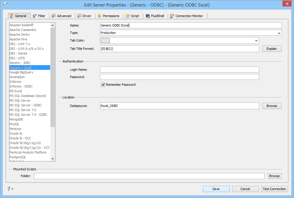 When registering a server using the Generic-ODBC connection type, make sure you specify the location of the driver which you will be using, with the correct URL and driver name. When registering a Generic-ODBC connection make sure that an ODBC data source has already been created for use.