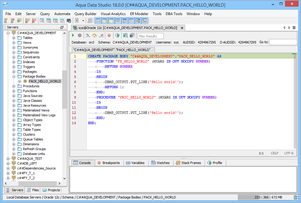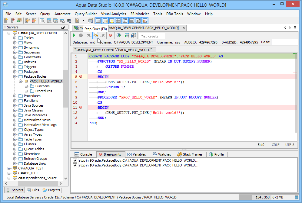 The Oracle SQL Debugger has been designed to help with testing and debugging of SQL functions and procedures for Oracle versions 9i and above. Launching the Oracle SQL Debugger The Oracle SQL Debugger is launched through a right click in the Schema Browser on Stored Procedures or User Defined Functions and selecting Debug from the popup menu. More than one debugger can be open at once, with each object to be debugged opened in a separate tab. Debugger Workspace The debugger displays a slightly modified version of the Query Analyzer Toolbar containing debugger specific menus and buttons. Along the top of the debugger are the Execute, Stop, Step Into, Step Over, Step Return, Toggle Breakpoint, Turn On Profiling, Target Query Window, Debugger Query Window buttons. Next to the buttons is the Display Max Results input field. Beneath the buttons is the connection information, username and SID information. The procedure or package displays in the debugging window, within which breakpoints can be added by right clicking and selecting "Toggle Breakpoint" from the popup menu. When this window has focus, and a line has been clicked, it is also possible to select "Run to Cursor," to run the debugger up to that line in the procedure. From the same popup menu, "Go to Current Line" brings the cursor to the current line, which is very useful when debugging multiple lengthy procedures. Below the debugger window are tabs for Console, Breakpoints, Variables, Watches, Stack Frames and Profile. The Console tab displays any errors or messages generated as debugging progresses. The Breakpoints tab indicates the lines of the procedure where breakpoints are set and allows them to stop execution or not. The Variables tab lists any variables by name, their value and type. The Watches tab allows selecting specific variables to be observed as they change, reducing from a possible list of hundreds to a select group. The Stack Frames tab lists the local variables of the functions, and the arguments to them. The Profile tab lists commonly used terms or values a user works with on a regular basis in the debugging process. Once execution of a procedure has begun through the use of the Start button at the top of the debugger window, the bottom left of the window is occupied by the Text, Text History, Grid, and Pivot Grid Results tabs. This area functions just as the Query Analyzer window does, revealing the results of procedures at each breakpoint or execution cursor. The Oracle SQL Debugger features include: