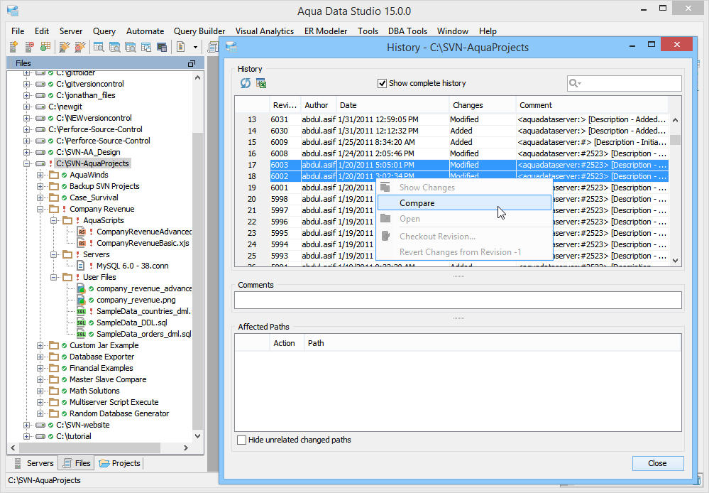 How to update a Version Control file or repository Within the scripts pane, right click on a repository, directory or file and select Update. This will retrieve the latest version from the remote repository. How to add a file to Version Control Within the scripts pane, left click on a file, files or directory to select, then right click to select "Add". This will include the selection in the repository for versioning. How to delete a file in Version Control Within the scripts pane, left click on a file, files or directory to select, then right click and navigate to "Version Control" to select "Delete". This will delete the selection from the repository. Within the Repository Browser, right clicking on an item and selecting Delete functions the same way. How to revert a file in Version Control Within the scripts pane, left click on a file, files or directory to select, then right click and navigate to "Version Control" to select "Revert". This will revert the selection in the repository. How to Show History in Version Control Within the scripts pane, left click on a file, files or directory to select, then right click and navigate to "Version Control" to select "Show History...". This will display the Version Control history of the selection in the repository. Within the Repository Browser, expanding the tree to select the file or directory you wish to view the history on, then left clicking it brings up its history in the History Table. The history displayed in the Repository Browser and the history displayed when selecting Version Control->Show History work similarly. Show History Dialog (window) Right clicking on a versioned item in the Files Browser gives direct access to show the history of that item. The resulting Show History dialog provides a list of all of the version control actions on a file or directory, and the revision's contained files. By default, the Show History Dialog only shows the most recent changes. If the "Show Complete History" option is enabled, all of the actions taken since the creation of the repository will be listed. Each action can be inspected in a table with columns for Revision, Author, Date, Changes and Comments. Two items in this history can be selected and compared to show the differences in actions and content over time. An item in the history can also be selected to "show changes" in the file as a comparison to its previous revision. Once a revision is identified within the History, right clicking on it also allows a checkout of that specific revision or a revert to that specific revision. At the bottom of the Show History is an area displaying affected paths of a revision, with an option for hiding unrelated changed paths. The Subversion (SVN) Repository Browser is a convenient way to view all of the contents of a repository, even when no working copies have been mounted locally. While the Repository Browser shows details on item history, it does not show the status of local working versions. It is more for exploring the remote repository and its contents than managing the local versions of files. To Launch the Repository Browser, right click on an item in the Files Browser and select Version Control -> Browse Repository. A window appears with the url to the repository in its title. An expandable tree view appears on the left and a history for the selected items in the tree appears on the right. The Subversion (SVN) Repository Browser points to the repository root when launched and offers an in-depth, explorable view of all of the files in a repository without requiring a local version of its content. The repository is displayed as a tree where action can be taken on individual items, or they can simply be viewed. The History table within the Repository Browser allows opening and comparing of individual items by way of a popup menu. Tree content is obtained with a background thread so that Aqua Data Studio’s other tools can be used while information from the repository is being retrieved. In the Affected Paths display, unrelated changed paths can be hidden. Inside the tree, right clicking on items allows checkout, new remote folder, rename, move, branch, delete, copy url and refresh. The Browse Repository menu item invokes the browser, pointing to the repository root, showing a tree, history table, and a "show complete history" checkbox for viewing the complete history of items in the repository. Clicking on item in the history table can also shows affected paths when it is enabled. Repository Browser Tree popup menu Right clicking within the repository browser launches a menu with checkout, new remote folder, rename, move, branch, delete, copy url, and refresh menu options. Repository Browser History Table and popup menu The Repository Browser History contains much of the functionality of the Show History Dialog mentioned above. Clicking on items within the Repository Browser History Table brings up menu options for show changes, compare, open, compare with revision, compare repository revisions. The history content is obtained in a background thread, allowing Aqua Data Studio's other operations to continue uninterrupted. Additional Subversion features